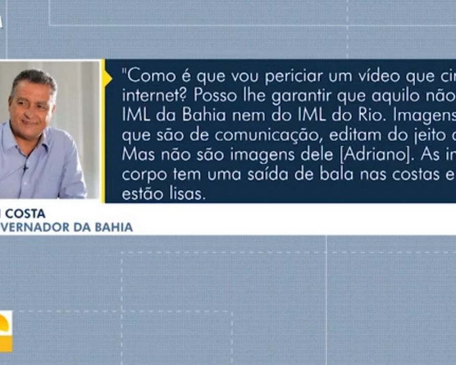 O governador da Bahia, Rui Costa, disse na quarta-feira (19), que o corpo mostrado em um vídeo postado pelo senador Flávio Bolsonaro como sendo do miliciano Adriano da Nóbrega não é do ex-capitão do Bope, morto durante operação policial, este ano, em um sítio na zona rural da cidade de Esplanada, na Bahia.