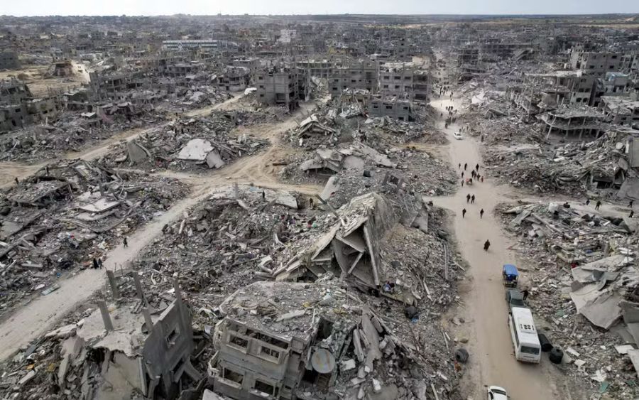 As ações de Israel deslocaram 90% da população de Gaza e reduziram edifícios a escombros. A vibrante cor da vida antes da guerra desbotou para um cinza monótono de cimento que domina o território. A reconstrução pode levar décadas.